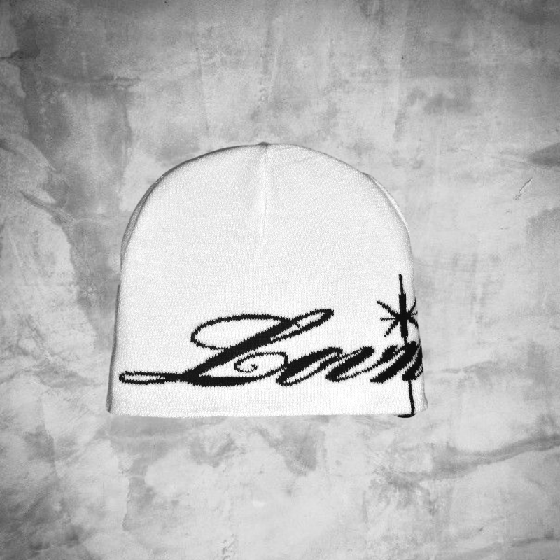 Gorro reversible blanco y negro con un diseño ¨minimalista¨ en cursiva.